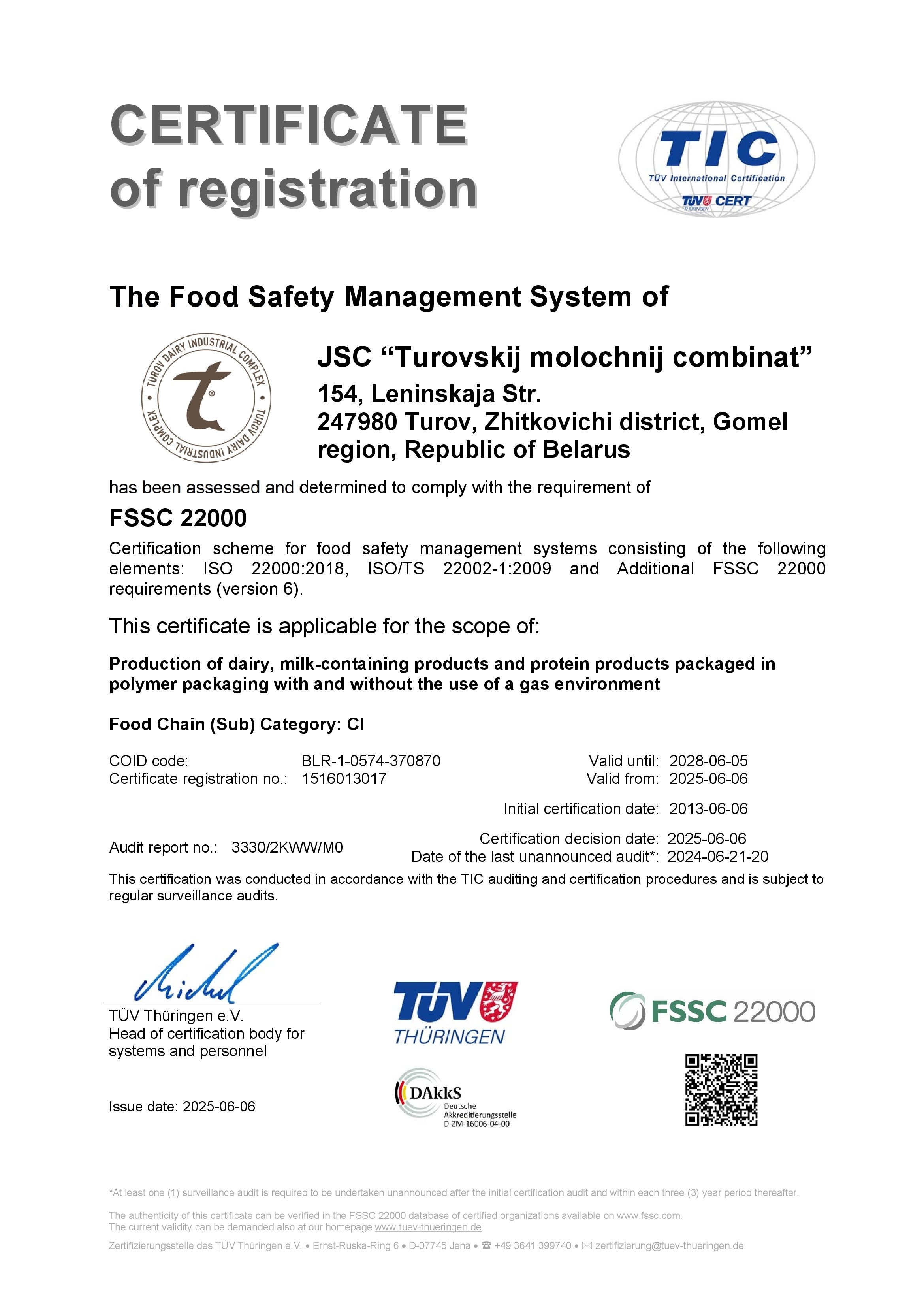 The certificate of conformity of the foodstuff safety management system to the requirements of FSSC 22000 was granted by TÜV Thüringen e.V. Company (ISO 22000, HACCP).